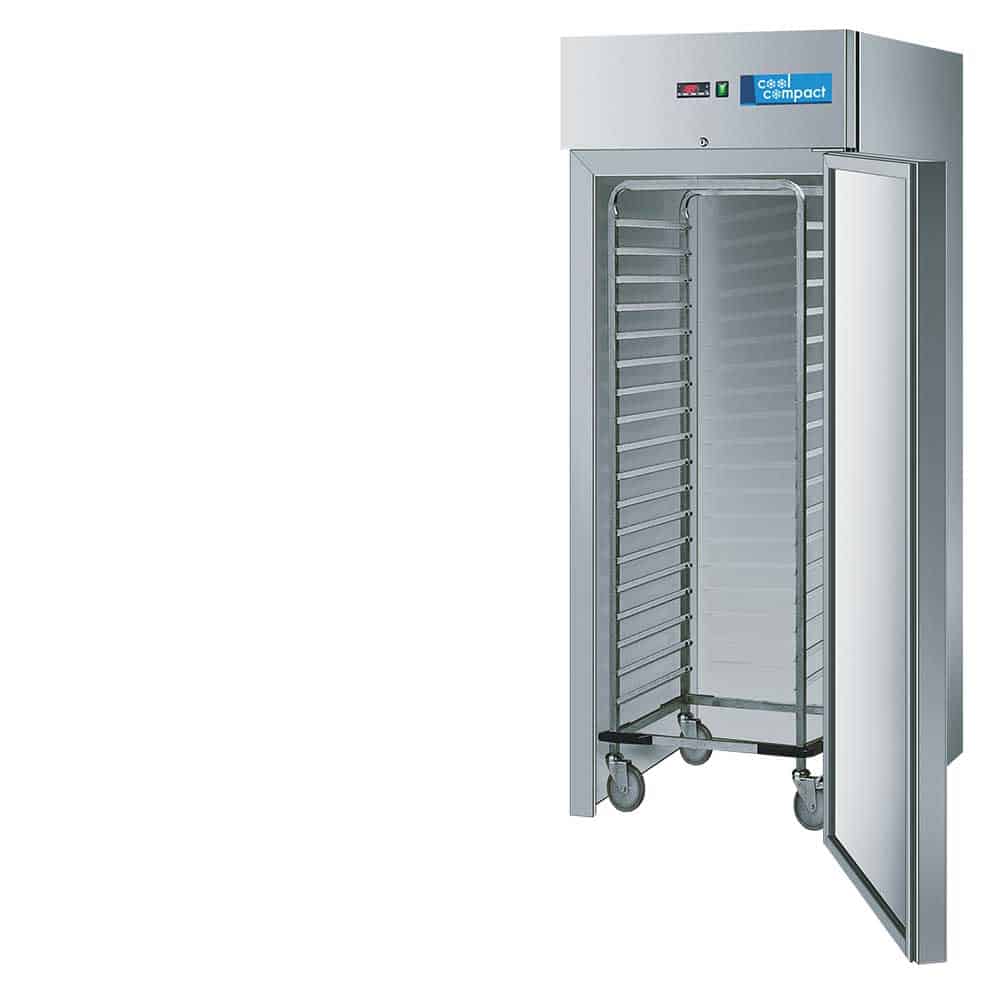 Armoire Chauffante à Chariot1 Porte. Temp: +50°C / +80°C.Avec Groupe Logé. Intérieur et extérieur complétement en inox AISI 304. Monobloc extérieure ; Porte avec fermeture automatique et serrure ; Conception hygiénique ; Contrôle électronique, mode ECO automatique, écran LCD de 3 pouces. Dotation: Eclairage à LED, 3 Grilles inox, 3 glissieres – Puissance Elt: 2,63 Puissance Frigo: 0 – Dim: 770x800x2100 – Poid: 190