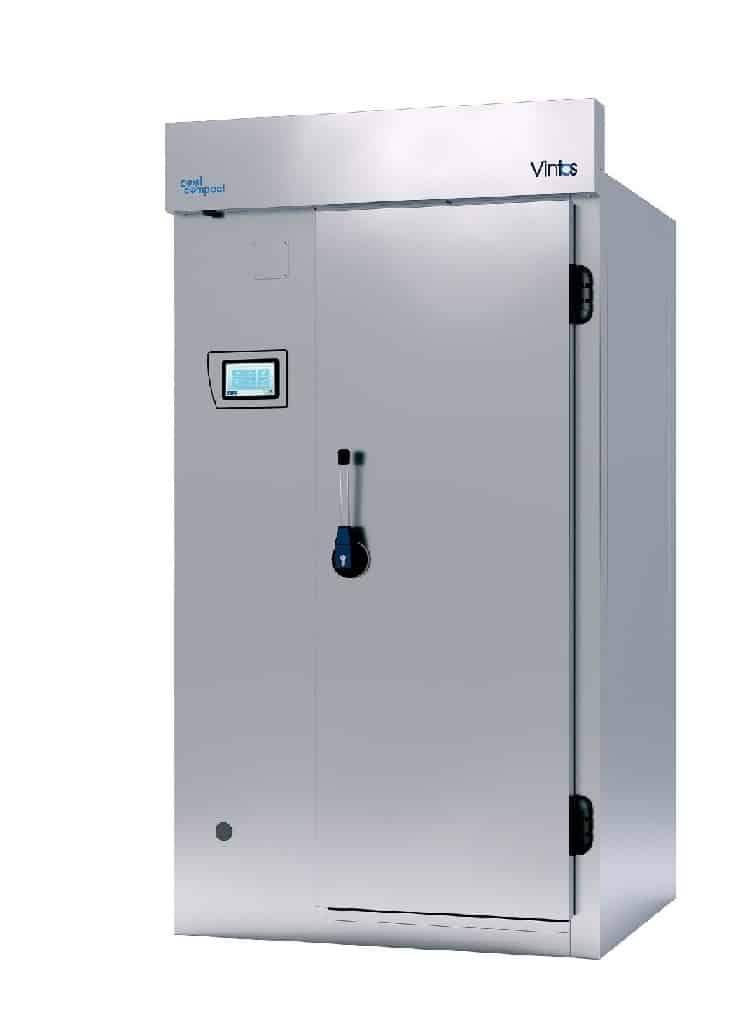 Cellule de refroidissement et congelation rapide VINTOS. Capacité de charge : 20 x GN1/1, Dimensions : 1300 x 1246 x 2,433 mm (L x T x H) Puissance électrique : 400 V / 7,5 kW Puissance frigorifique : 14,7 kW -10°C VT 6,7 kW -35°C VT