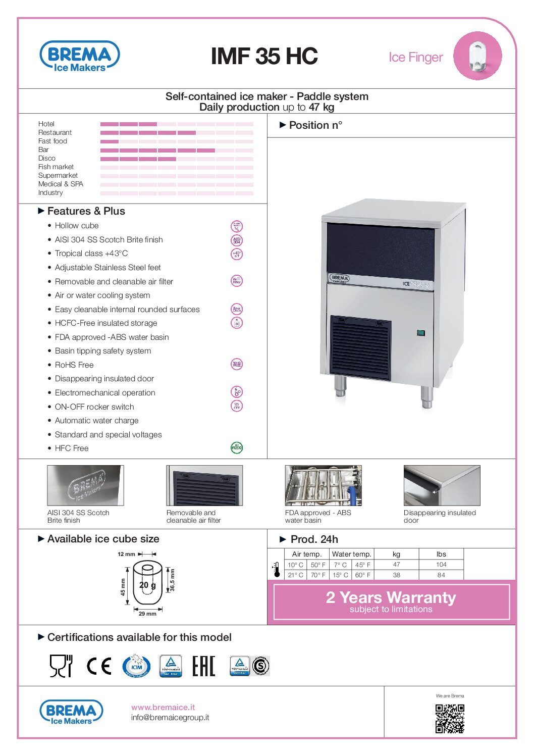 La machine à glaçons Brema IMF ICE Finger est un appareil professionnel spécialement conçu pour produire des glaçons en forme de doigts, adaptés aux secteurs de la restauration, des bars, et des établissements hôteliers. Ces glaçons sont idéaux pour les boissons, car leur forme unique permet un refroidissement rapide et une fusion plus lente, améliorant ainsi la qualité de service. Caractéristiques principales : Glaçons en forme de doigt : La gamme IMF produit des glaçons cylindriques et creux, parfaits pour les boissons, offrant une grande surface de contact pour un refroidissement efficace tout en fondant lentement. Construction robuste : Fabriquée en acier inoxydable, cette machine est durable, résistante à la corrosion, et facile à entretenir, garantissant une hygiène impeccable et une longue durée de vie. Efficacité énergétique : Conçue pour minimiser la consommation d’eau et d’électricité, elle assure une production continue et optimisée, tout en maintenant des coûts de fonctionnement réduits. Panneau de commande intuitif : Simple à utiliser, le tableau de bord permet de régler facilement les paramètres de production et d’entretien, avec un système d’auto-diagnostic intégré pour simplifier la maintenance. La Brema IMF ICE Finger est l’option idéale pour les professionnels recherchant une machine performante, durable et économe en énergie, capable de produire des glaçons de haute qualité adaptés aux besoins spécifiques de leurs établissements.