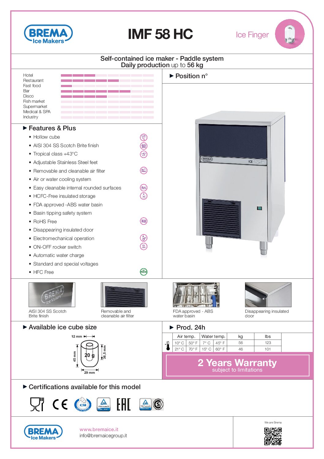 La machine à glaçons Brema IMF ICE Finger est un appareil professionnel spécialement conçu pour produire des glaçons en forme de doigts, adaptés aux secteurs de la restauration, des bars, et des établissements hôteliers. Ces glaçons sont idéaux pour les boissons, car leur forme unique permet un refroidissement rapide et une fusion plus lente, améliorant ainsi la qualité de service. Caractéristiques principales : Glaçons en forme de doigt : La gamme IMF produit des glaçons cylindriques et creux, parfaits pour les boissons, offrant une grande surface de contact pour un refroidissement efficace tout en fondant lentement. Construction robuste : Fabriquée en acier inoxydable, cette machine est durable, résistante à la corrosion, et facile à entretenir, garantissant une hygiène impeccable et une longue durée de vie. Efficacité énergétique : Conçue pour minimiser la consommation d’eau et d’électricité, elle assure une production continue et optimisée, tout en maintenant des coûts de fonctionnement réduits. Panneau de commande intuitif : Simple à utiliser, le tableau de bord permet de régler facilement les paramètres de production et d’entretien, avec un système d’auto-diagnostic intégré pour simplifier la maintenance. La Brema IMF ICE Finger est l’option idéale pour les professionnels recherchant une machine performante, durable et économe en énergie, capable de produire des glaçons de haute qualité adaptés aux besoins spécifiques de leurs établissements.