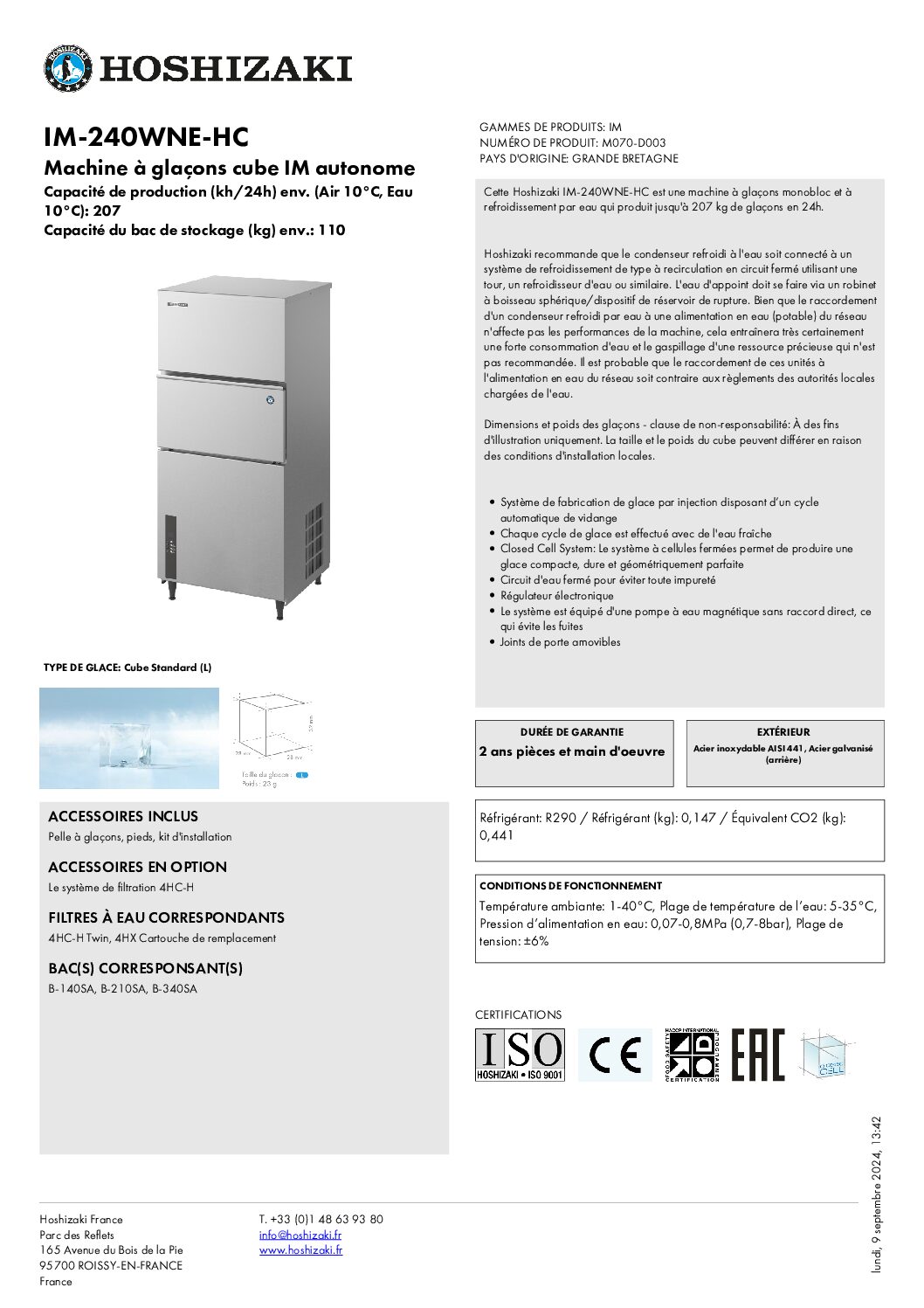 **Durable**: La IM-240WNE-HC  utilise R290. L’utilisation du réfrigérant naturel HC R290 réduit considérablement la consommation énergétique globale de nos machines à glaçons., **Matériaux**: Les finitions extérieures sont en Inox et le circuit d’eau fermé offre une protection maximale contre tout type d’impureté pendant tout le processus de fabrication. Toutes nos machines sont faciles à utiliser, nettoyer et entretenir., **Technologie Unique**: Un jet d’eau fraîche est injecté individuellement dans chacune cellules isolées. L’excédent d’eau est éliminé à travers une série de trous sur la base de la plaque. Les cavités des cellules contraignent l’expansion de la glace de chaque côté, tout en atteignant une température de -30°C pendant le processus de formation. Grâce au système de rinçage automatique, les impuretés sont éliminées, procurant ainsi une glace cristalline, tout en protégeant votre machine de la calcification et l’accumulation de minéraux., **Conception Intelligente**: Nos appareils sont conçus pour durer – ils disposent d’une conception intelligente, comme une pompe à eau magnétique sans couple direct. Cet élément emp êche les fuites du circuit d’eau et améliore la durée de vie de l’appareil., **Ajustement parfait**: Les dimensions contenues de nos machines à grains à bac intégré leur permettent de s’intégrer parfaitement dans les espaces les plus étroits., **Plug & Play**: La conception intelligente plug-and-play garantit une installation extr êmement simple et rapide.