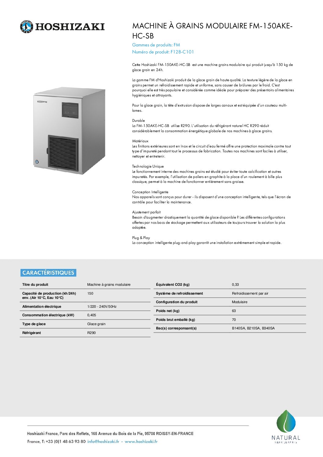 **Durable**: La FM-150AKE-HC-SB Â utilise R290. L’utilisation du réfrigérant naturel HC R290 réduit considérablement la consommation énergétique globale de nos machines à glace grains., **Matériaux**: Les finitions extérieures sont en Inox et le circuit d’eau fermé offre une protection maximale contre tout type d’impureté pendant tout le processus de fabrication. Toutes nos machines sont faciles à utiliser, nettoyer et entretenir., **Technologie Unique**: Le fonctionnement interne des machines grains est étudié pour éviter toute calcification et autres impuretés. Par exemple, l’utilisation de paliers en graphite à la place d’un roulement à bille plus classique, permet à la machine de fonctionner entièrement sans graisse., **Conception Intelligente**: Nos appareils sont conçus pour durer – ils disposent d’une conception intelligente, tels que l’écran de contrôle pour faciliter la maintenance., **Ajustement parfait**: Besoin d’augmenter drastiquement la quantité de glace disponible ? Les différentes configurations offertes par nos bacs de stockage permettent aux utilisateurs de toujours trouver la solution la plus adaptée., **Plug & Play**: La conception intelligente plug-and-play garantit une installation extr êmement simple et rapide.