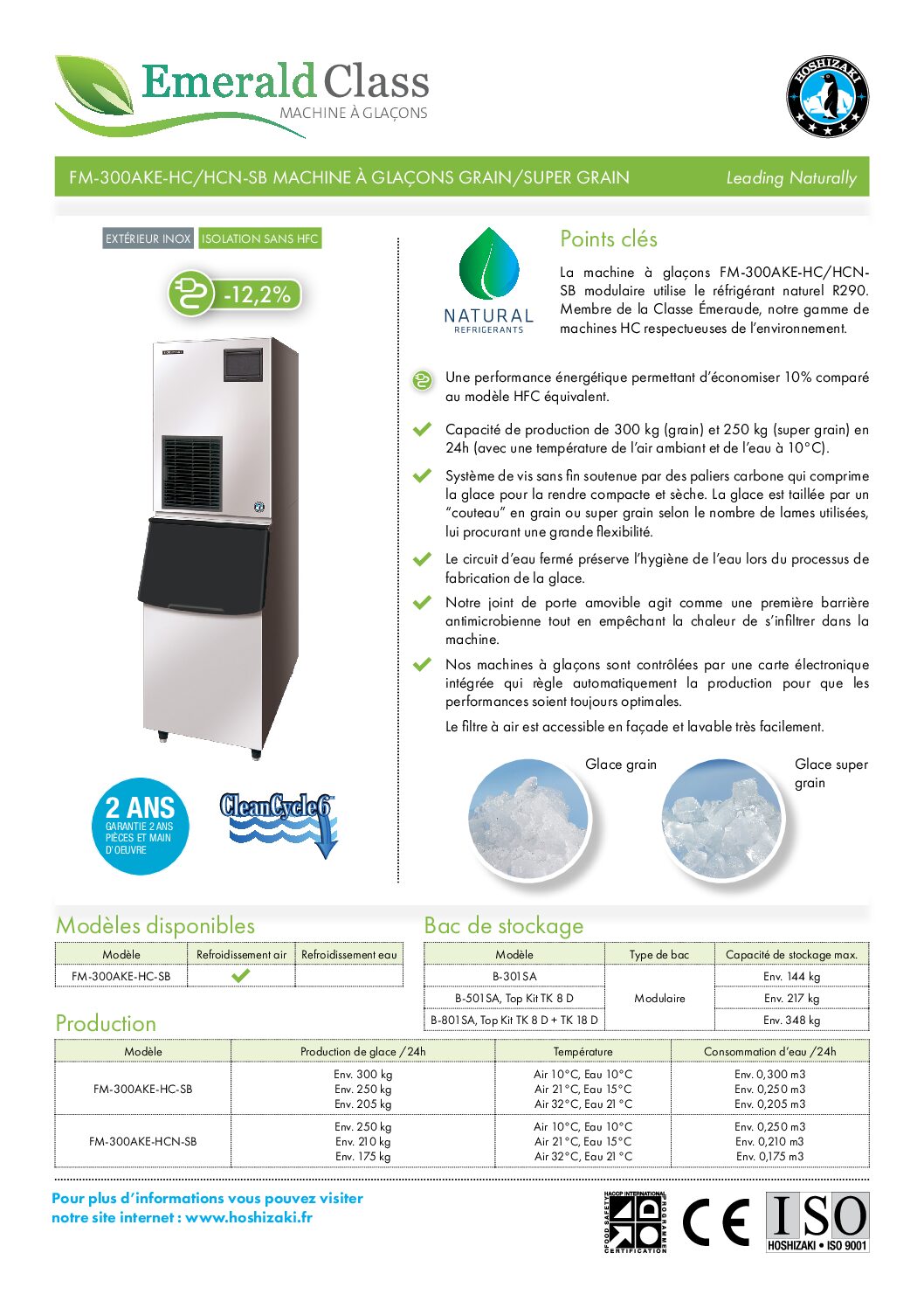 **Durable**: La FM-300AKE-HC-SB  utilise R290. L’utilisation du réfrigérant naturel HC R290 réduit considérablement la consommation énergétique globale de nos machines à glace grains., **Matériaux**: Les finitions extérieures sont en Inox et le circuit d’eau fermé offre une protection maximale contre tout type d’impureté pendant tout le processus de fabrication. Toutes nos machines sont faciles à utiliser, nettoyer et entretenir., **Technologie Unique**: Le fonctionnement interne des machines grains est étudié pour éviter toute calcification et autres impuretés. Par exemple, l’utilisation de paliers en graphite à la place d’un roulement à bille plus classique, permet à la machine de fonctionner entièrement sans graisse., **Conception Intelligente**: Nos appareils sont conçus pour durer – ils disposent d’une conception intelligente, tels que l’écran de contrôle pour faciliter la maintenance., **Ajustement parfait**: Besoin d’augmenter drastiquement la quantité de glace disponible ? Les différentes configurations offertes par nos bacs de stockage permettent aux utilisateurs de toujours trouver la solution la plus adaptée., **Plug & Play**: La conception intelligente plug-and-play garantit une installation extr êmement simple et rapide.