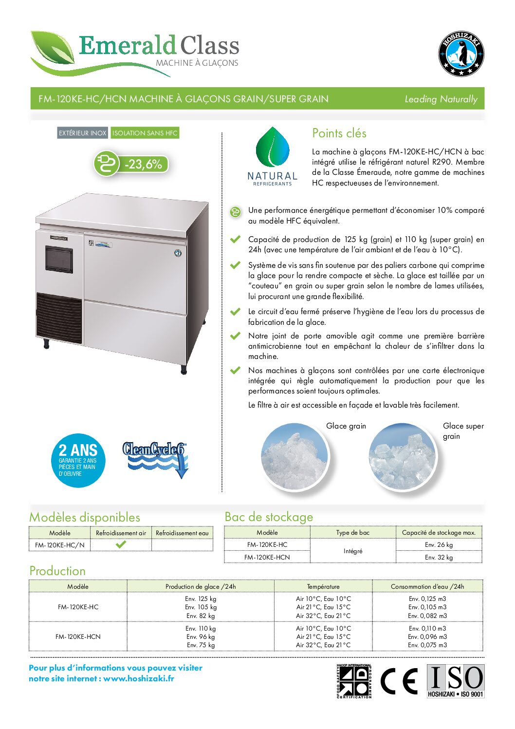 Cette Hoshizaki FM-120KE-HCN est une machine à grains monobloc qui produit jusqu’à 110 kg de glace grain en 24h. La gamme FM d’Hoshizaki produit de la glace grain de haute qualité. La texture légère de la glace en grains permet un refroidissement rapide et uniforme, sans causer de brûlures par le froid. C’est pourquoi elle est très populaire et considérée comme idéale pour préparer des présentoirs alimentaires hygiéniques et attrayants.Pour la glace grain, la tête d’extrusion dispose de larges canaux et est équipée d’un couteau multi-lames.