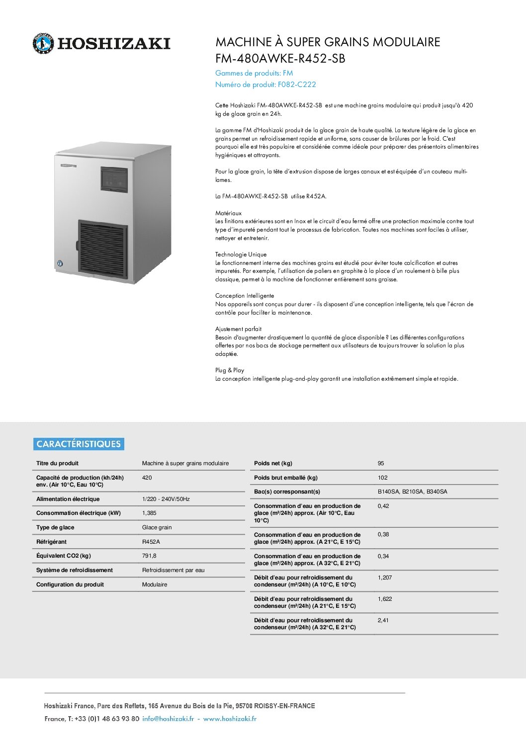 Cette Hoshizaki FM-480AWKE-R452-SB est une machine à grains modulaire qui produit jusqu’à 420 kg de glace grain en 24h. La gamme FM d’Hoshizaki produit de la glace grain de haute qualité. La texture légère de la glace en grains permet un refroidissement rapide et uniforme, sans causer de brûlures par le froid. C’est pourquoi elle est très populaire et considérée comme idéale pour préparer des présentoirs alimentaires hygiéniques et attrayants.Pour la glace grain, la tête d’extrusion dispose de larges canaux et est équipée d’un couteau multi-lames.