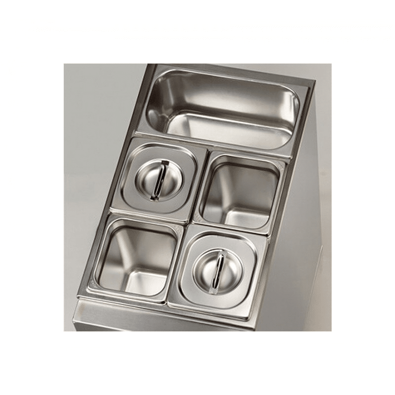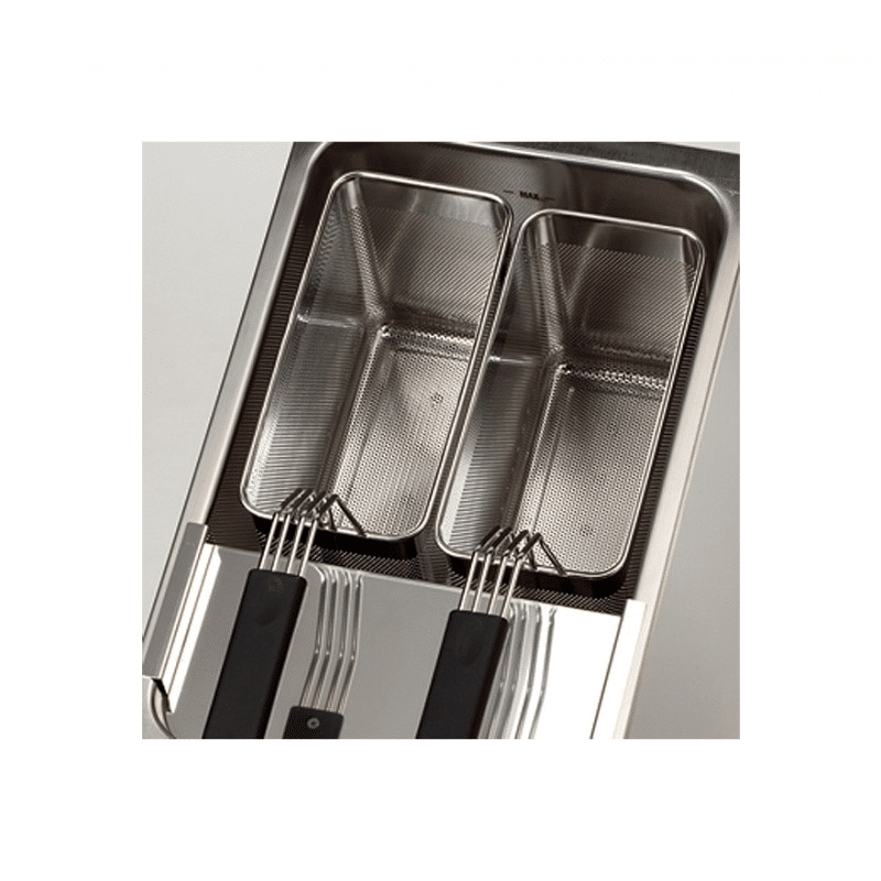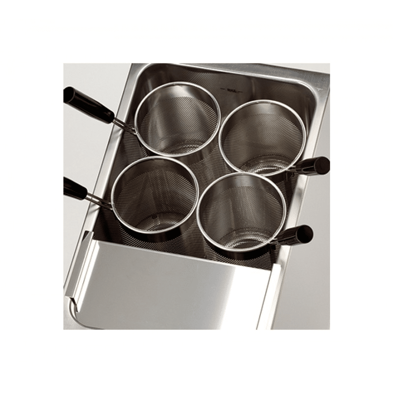 Cuiseurs à pâtes et cuiseur multi-fonctions avec encore plus de possibilités Cuire des pâtes2 paniers rectangulaires de 140x 280mm ou 4 ronds Ø140mm.Tablette inox sur l’avant pour égoutter les paniers. Autres compositions possibles. Bain-marieNombreuses combinaisons de bacs GN perforés pour cuire, blanchir, bouillir et pocher. Combinaison de bacs et couvercles GN 1/6, 1/3, 1/2, 1/1, profondeur 100/150/200mm et barres de support. Construction Entièrement en acier inoxydable, solide et durable Contenance 25 à 40 litres Cuve INOX 310 x 510 x 300-310mm (GN 1/1), résistante à l’eau salée, emboutie d’une pièce, facilitant le nettoyage Thermostat Réglable de 40 à 100°C Evacuation Robinet de vidange Accessoires Nombreux accessoires disponibles (voir sous “Accessoires”)