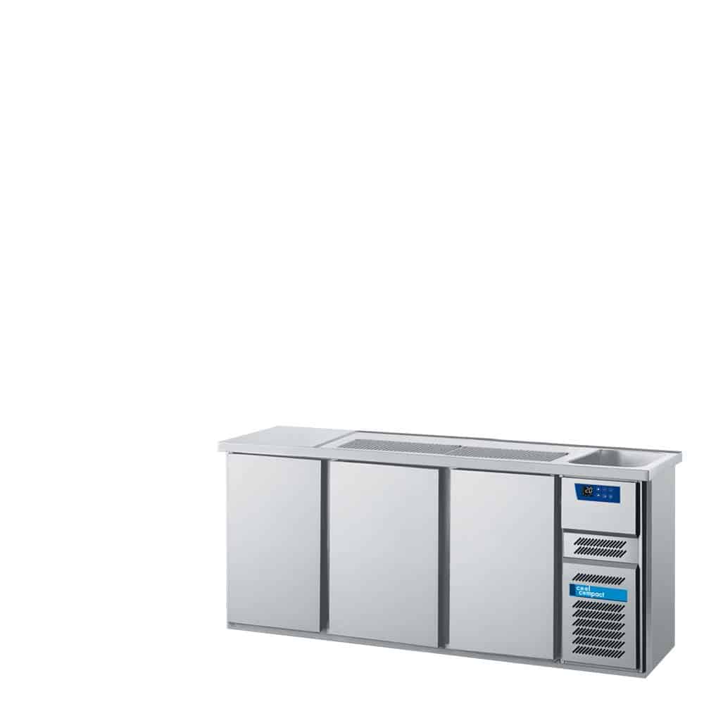 Table à boissons – H-Corp: 890. Socle en partie inferieure H40.Temp: +2°C/+10°C 3-Portes. C. techn. à droite. Avec plan H50. Temp: +2°C/+10°C . Avec Groupe Logé. Intérieur, Extérieur frontal totalement en inox AISI 304. Evaporateurs en cellule. Froid ventilé haute performance. Injection du châssis à haute pression. Contrôle électronique avec LCD 3 pouces. Dég. Autom. gaz chaud. Gaz: R290Dot.: 1 Grille rilsan, 1 paire de glissières par Porte. – Puissance Elt: 0,44 Puissance Frigo: 0,44 – Dim: 2100x700x980 – Poid: 210
